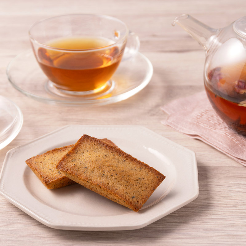 uRn.chAi&TeAのブレンドティー「EMMA」を混ぜ込んだ金塊型のフィナンシェ。柑橘のベルガモットにローズ、ラベンダーの花の香りを活かしたアールグレイのような華やかな印象と芳醇な香りをそのままに、おいしく仕上げました。